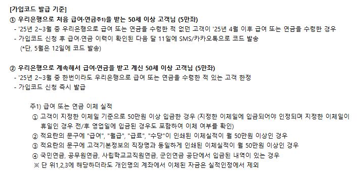 - 대상: 만 50세 이상이며, 우리은행 급여/연금 수령 고객