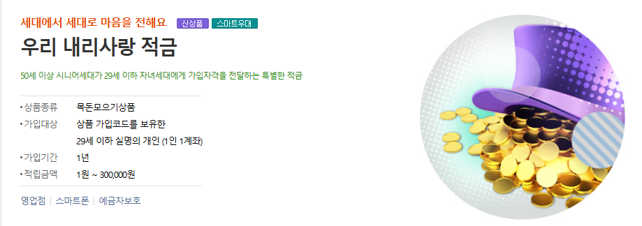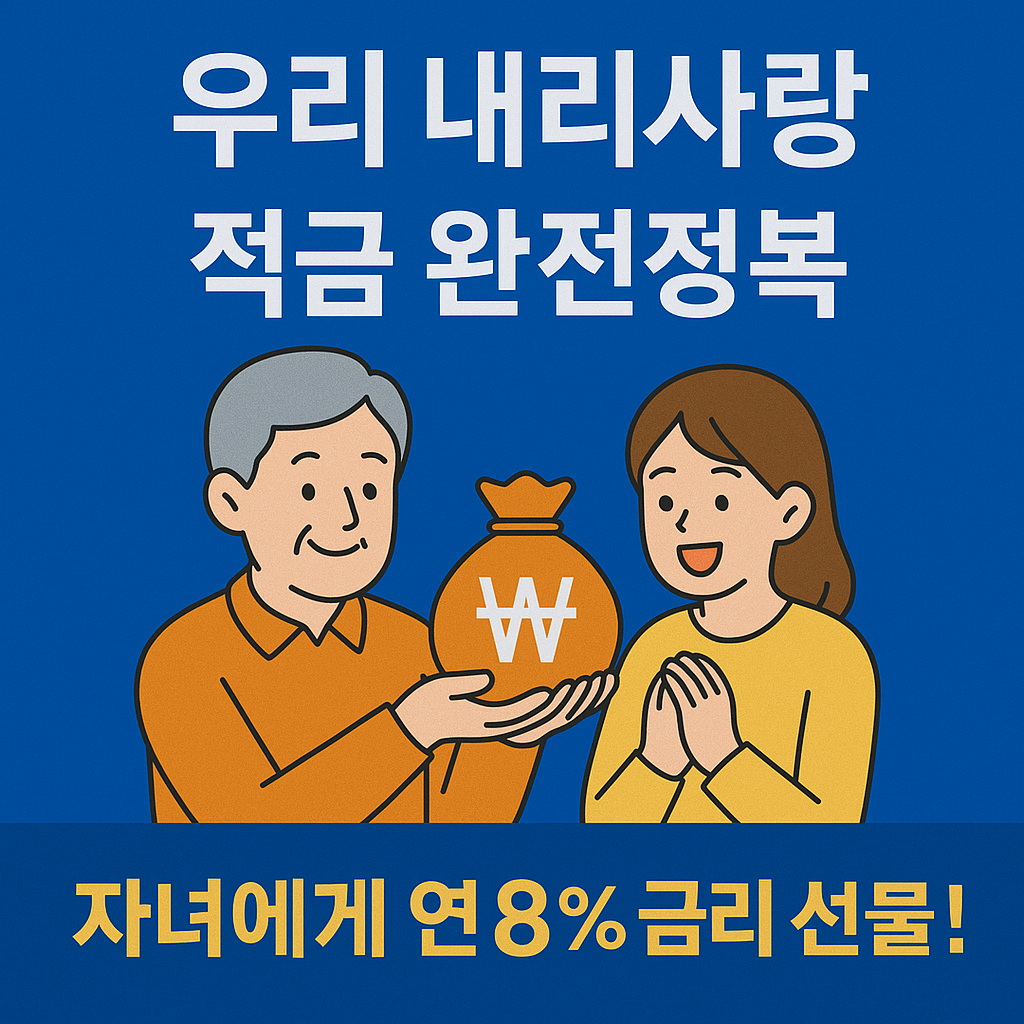 우리내리사랑 적금은 부모 세대(만 50세 이상)가 발급한 가입코드를 통해 자녀 세대(만 29세 이하)가 연 8.0% 고금리로 적금을 가입할 수 있는 우리은행의 이벤트성 금융상품입니다.