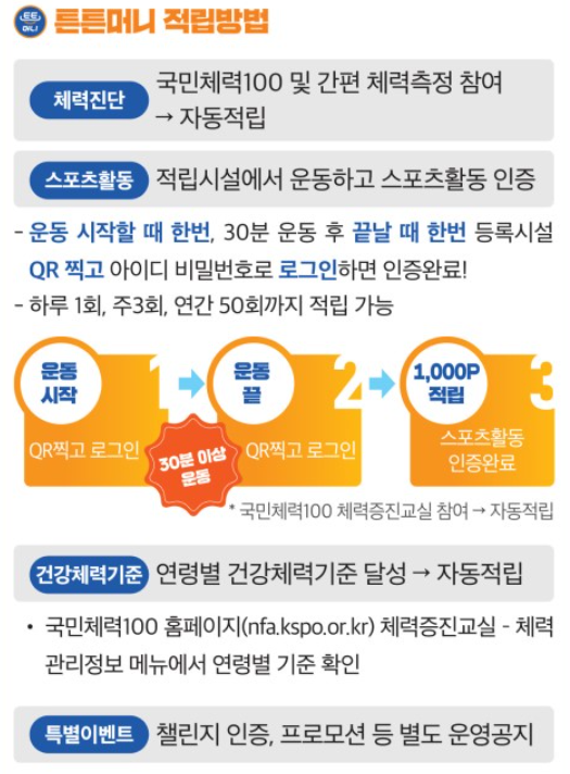 기본적으로는 국민체력100 체력인증센터에서 체력측정을 받으면 자동으로 머니가 적립됩니다. 또한 공공체육시설이나 제휴된 민간시설에서 운동이나 스포츠활동에 참여하는 것만으로도 머니가 차곡차곡 쌓이게 되죠.