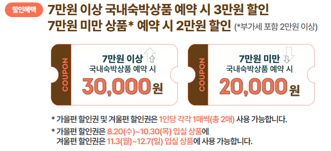 - 숙박상품 기준가가 7 만원 이상일 경우: 3만원 할인