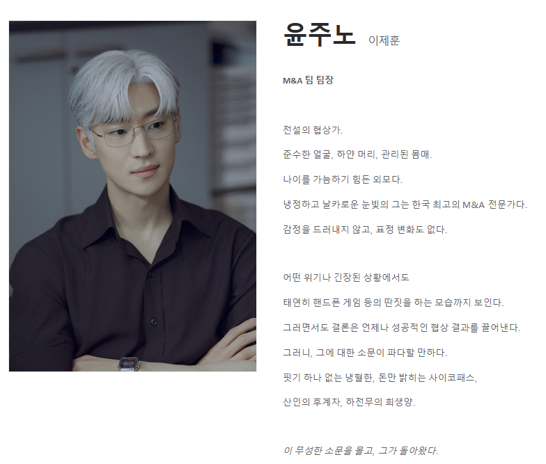 | 윤주노 | 이제훈 | M&A 팀장, 전설의 협상가 |