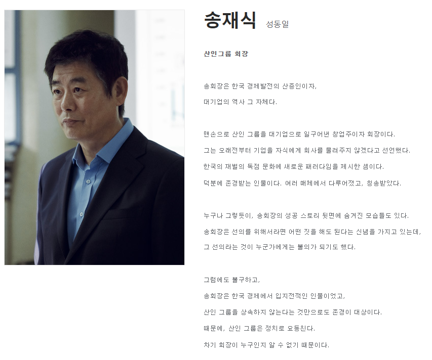 | 송재식 | 성동일 | 산인그룹 회장, 노련한 승부사 |